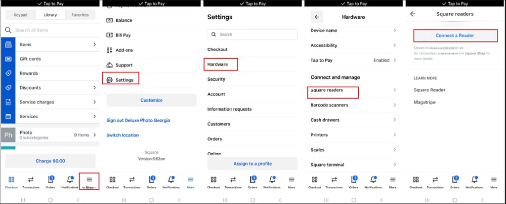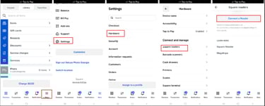 Open the Square app and navigate: "More" β "Settings" β "Hardware" β "Square Readers" β "Connect a Reader". π±