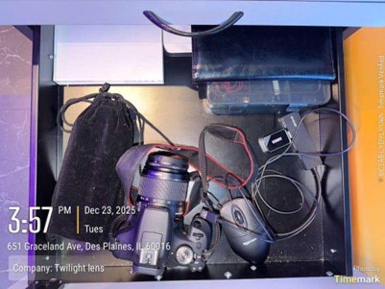 Take one photo of all the equipment in the drawer (camera, flash, etc.).